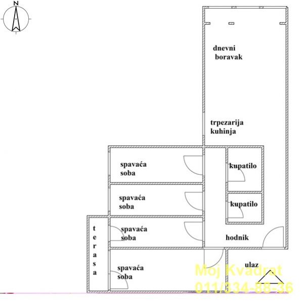 Prostorije: hodnik, dnevni boravak sa kuhinjom i trpezarijom, četiri spavaće sobe, dva kupatila i terasa. Jedna terasa je pripojena stambenom prostoru.